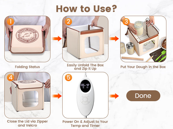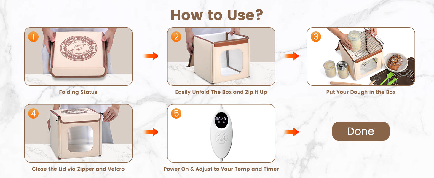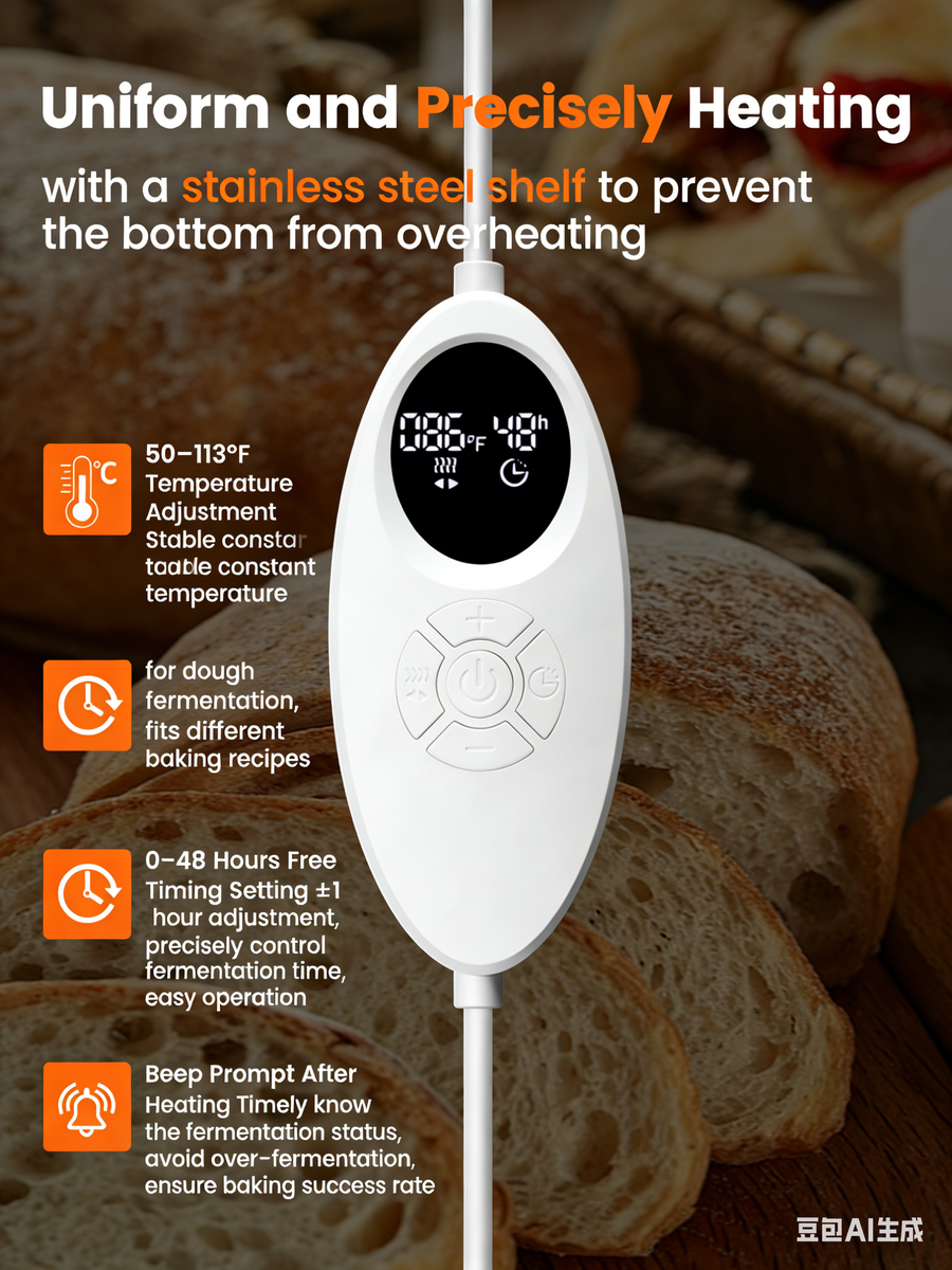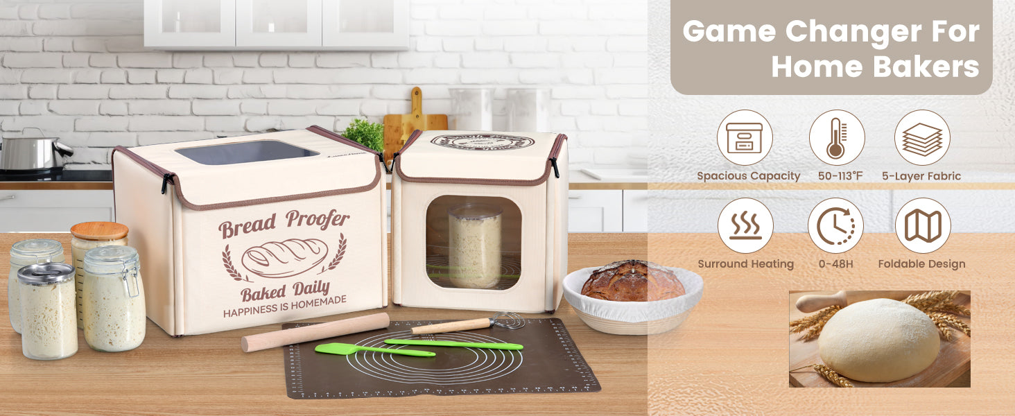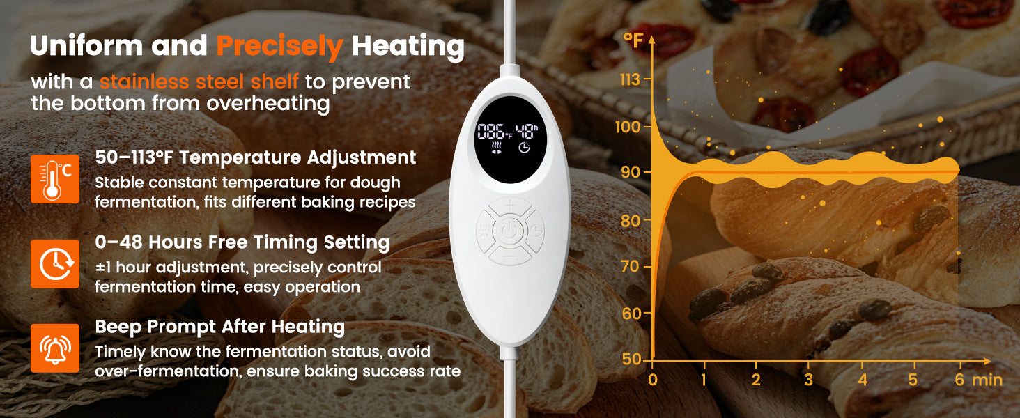 Our bread proofing box is equipped with a smart temperature controller that allows you to set the temperature between 50-113°F. Please ensure that the set temperature is not lower than the current room temperature.