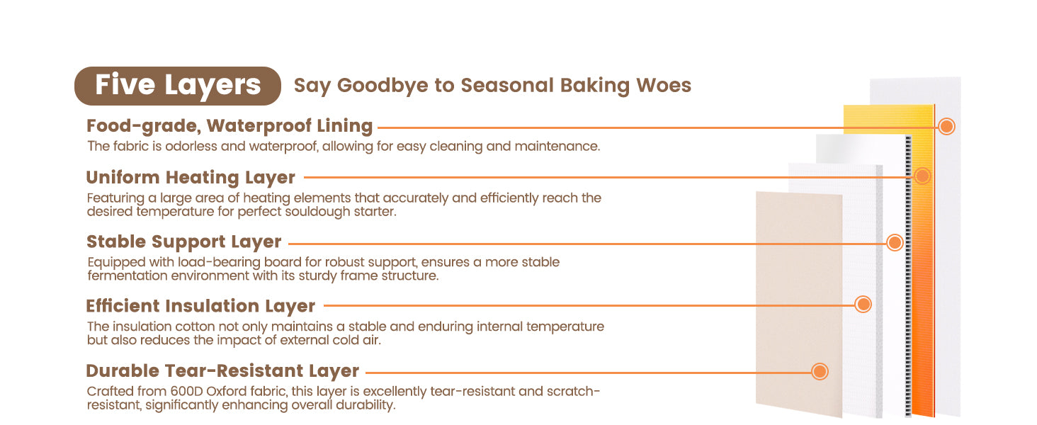 It features triple-side heating and five layers of fabric insulation. The included metal shelf also prevents the bottom from over-proofing, ensuring perfect fermentation even in cold weather.